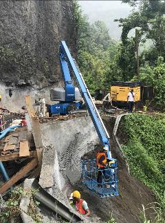 Grand‘Rivière ist ein abgelegenes Fischerdorf im Norden der Karibikinsel Martinique an den Ausläufern des Mount Pelée. Die ins Dorf führende Straße war dringend reparaturbedürftig – unter anderem mussten Unterbau und Stützwände verstärkt werden, zum Teil mit auskragenden Betonplatten. Zur Durchführung dieser Arbeiten benötigte das Team eine Arbeitsbühne mit einer gleichermaßen großen Horizontal- und Unterflurreichweite, angepasst an die schroffen Vertikalen an der Baustelle. Damit der Verkehr während der Bauarbeiten weiterfließen konnte, war zudem eine ausreichend kompakte Maschine notwendig. Unsichere Wetterverhältnisse machten die Arbeiten, für deren Fertigstellung ein Zeitrahmen von zwei Monaten kalkuliert war, nicht einfacher.