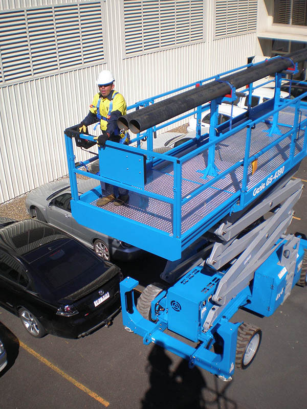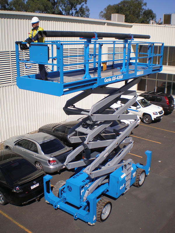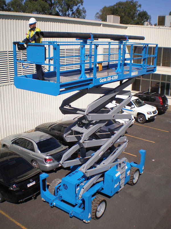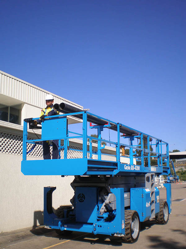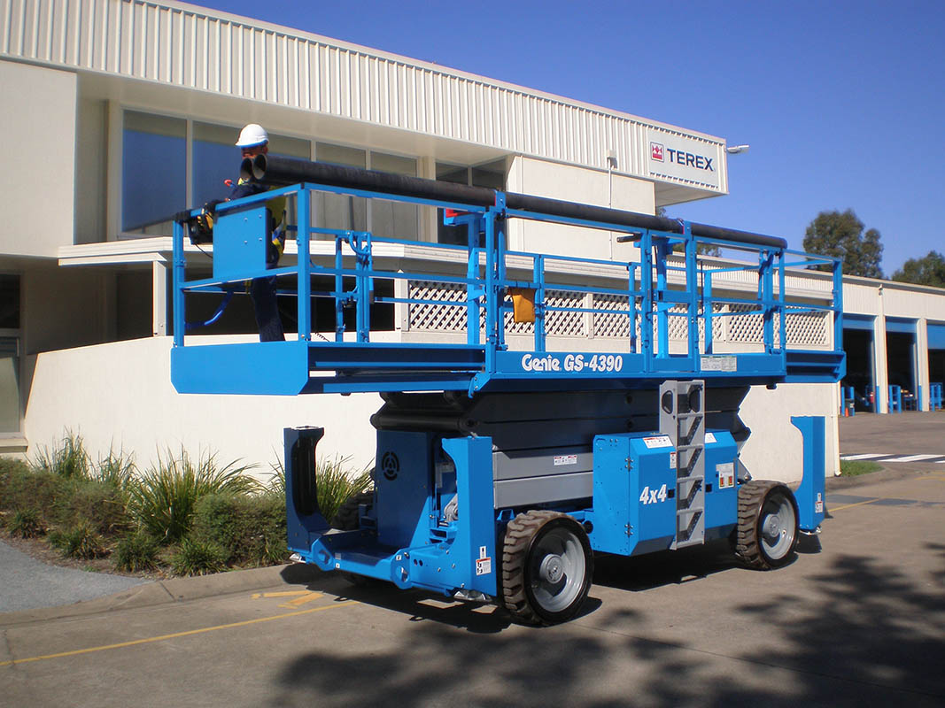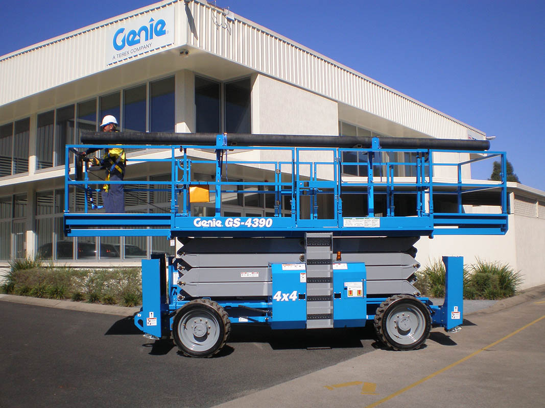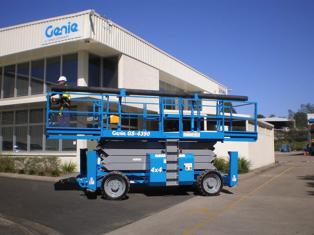 The Genie® GS™-4390 rough terrain scissor lift is built for extra-rugged performance and is able to traverse through uneven rough terrain environments.