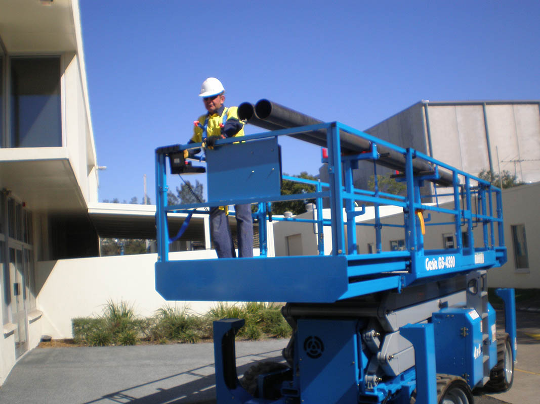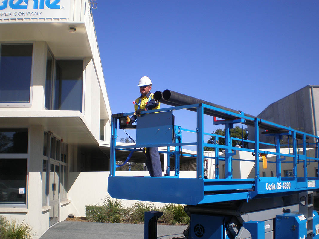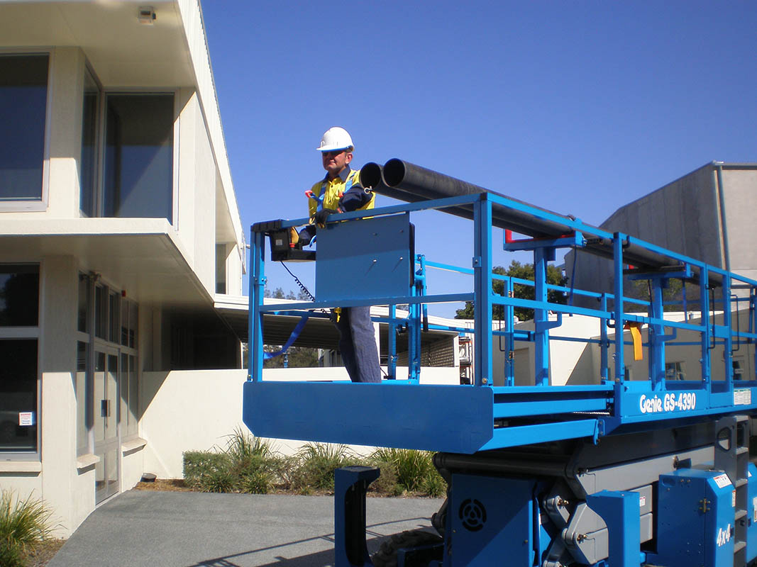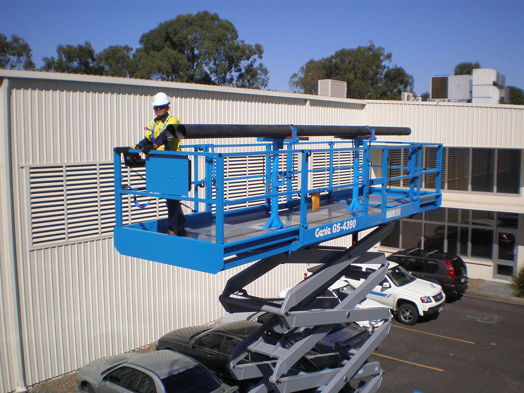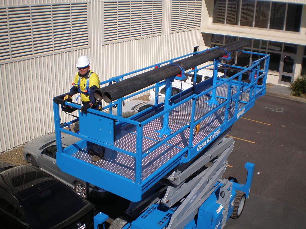 The Genie® GS™-4390 rough terrain scissor lift is built for extra-rugged performance and is able to traverse through uneven rough terrain environments.