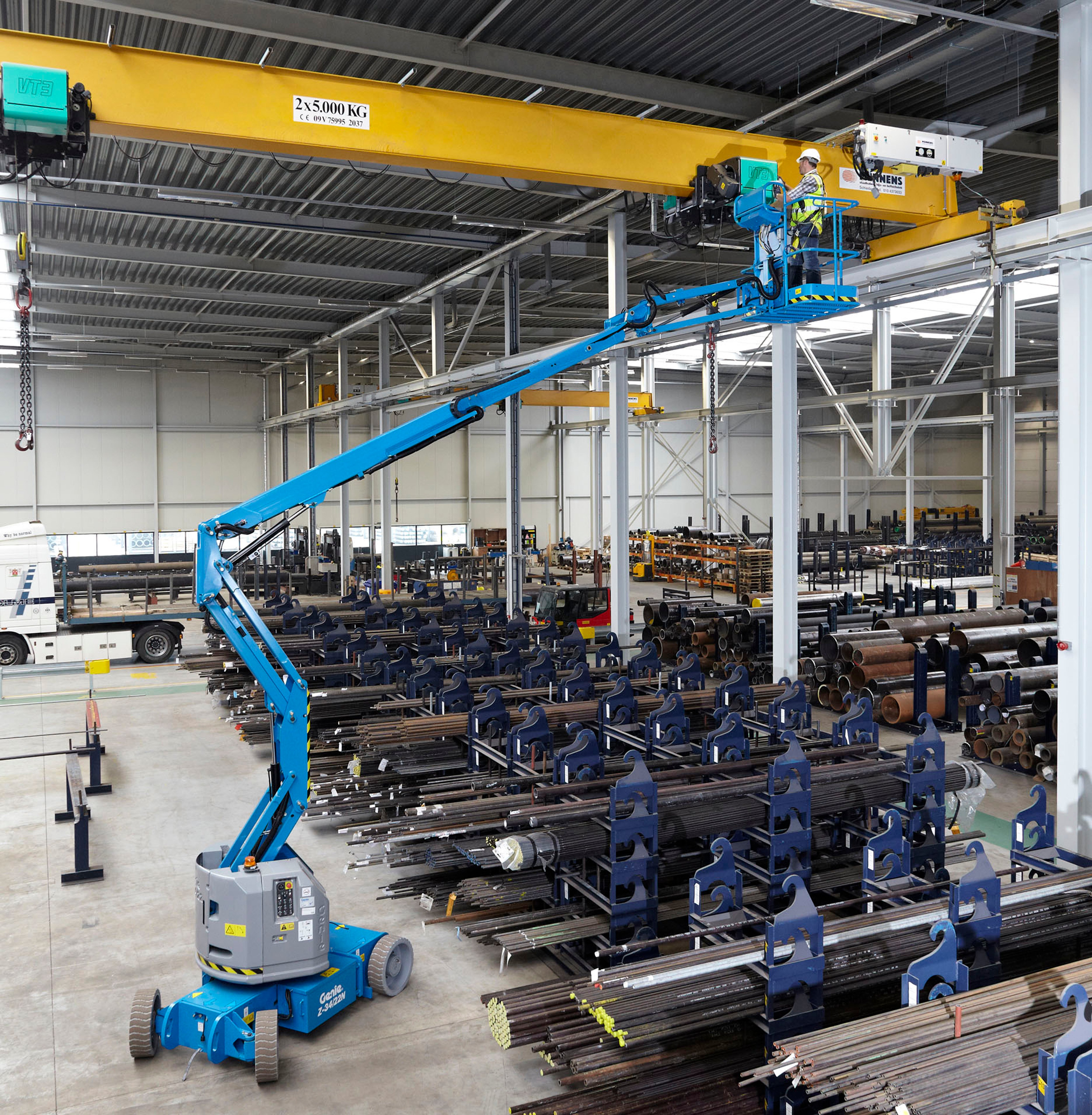 The Genie® Z®-34/22 N articulating boom lift offers quiet, emission-free operation. With this narrow electric lift, operators can easily drive through standard double doorways, work close to buildings or around obstacles and access overhead work from aisles or other congested areas.