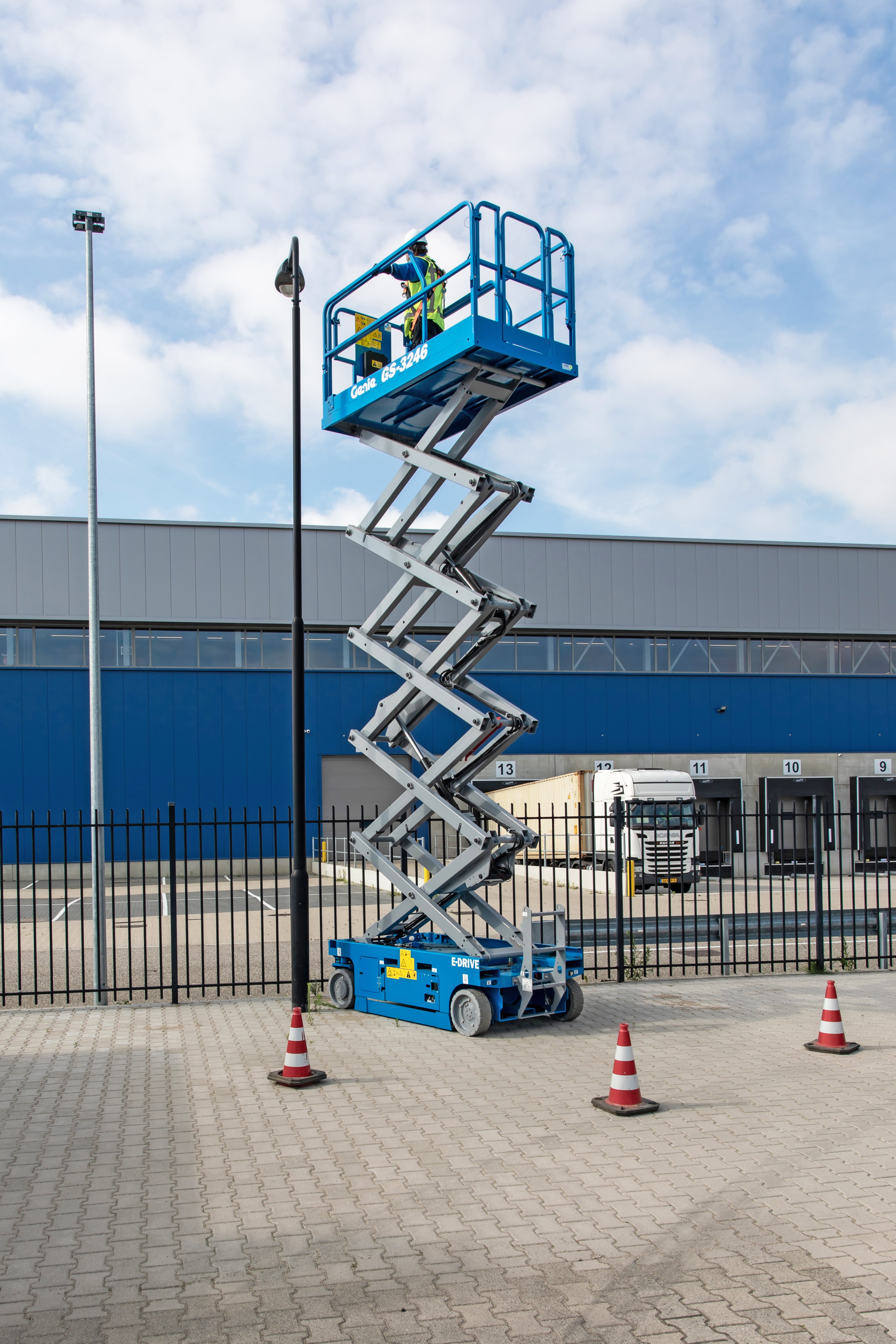 Compact dimensions and zero inside turning radius make the Genie® GS™-3246 E-Drive slab scissor lift ideal for indoor and outdoor construction, maintenance, and installation tasks on level ground and in tight spaces. Boasting the state-of-the-art Genie AC electric E-Drive system, it offers unmatched efficiency and runtime when a significant amount of driving is required.