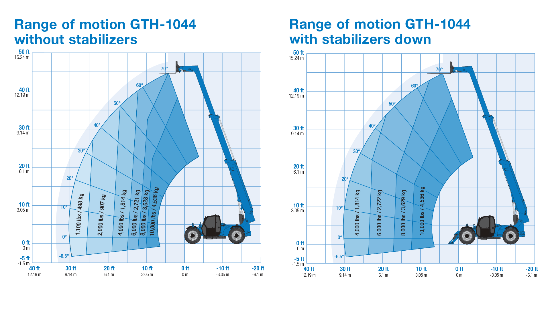 | Max Lift Height | 44 ft 7 in | 13.59 m |