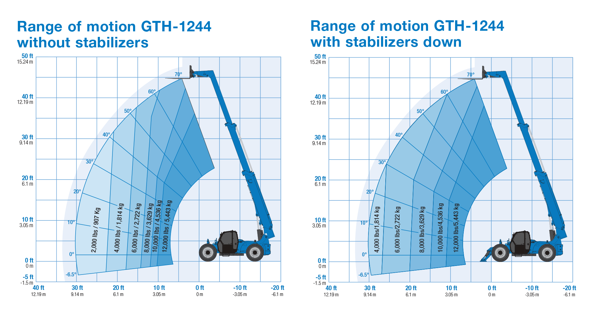 The Genie GTH™-1244 is a highly efficient pick-and-carry machine with a low total cost of ownership. Designed to offer the best load chart in its category class, it balances high performance with efficiency. To maximize operator productivity, the GTH-1244 can move around the jobsite without the need for stabilizers. With a maximum lift capacity of 12,000 lb | 5,443 kg, it is well-suited for industrial maintenance, infrastructure projects and the energy sector.