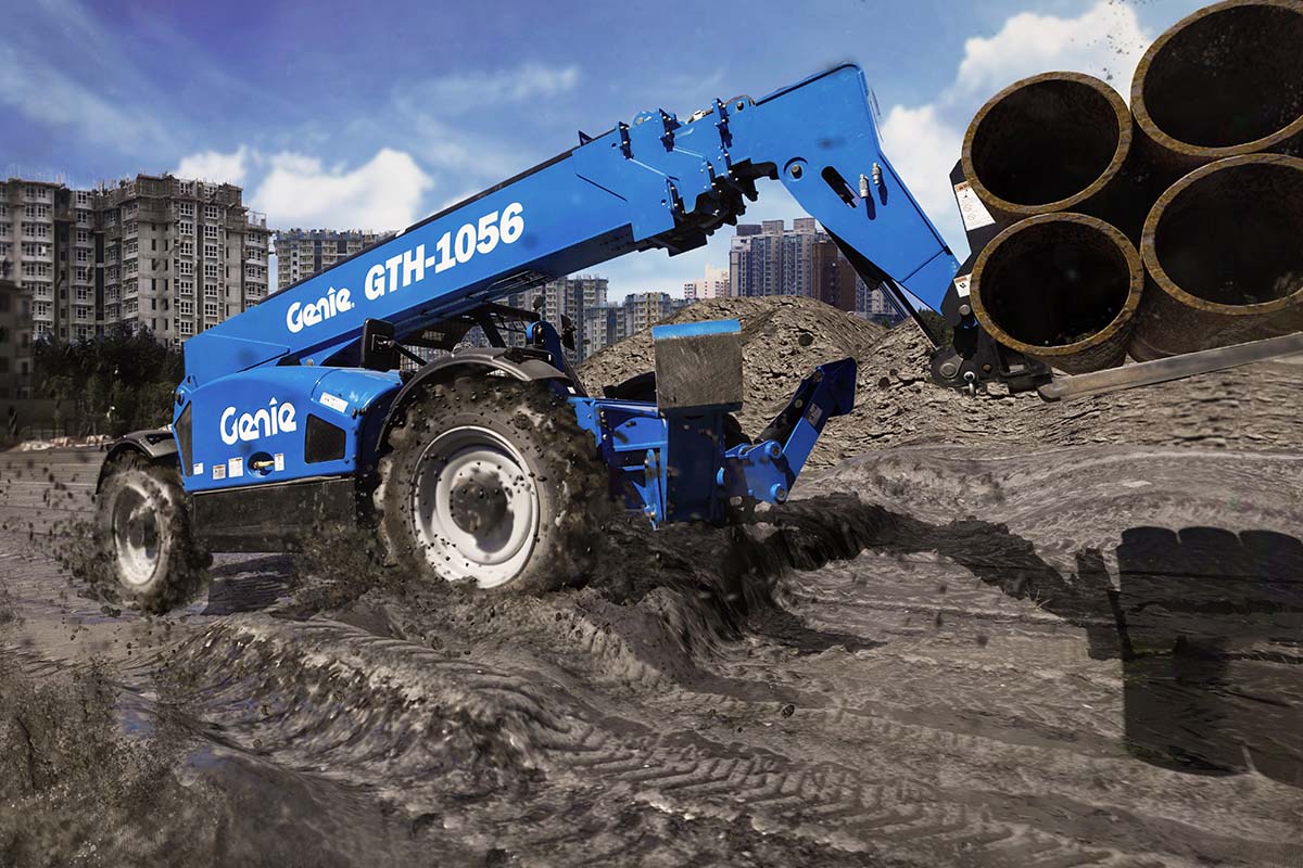 El manipulador telescópico Genie® GTH™-1056 ofrece excelente capacidad de elevación y un alcance horizontal máximo de 12,8 m para mover cargas pesadas sobre obstáculos. Su potente tracción en las cuatro ruedas y el motor diésel turboalimentado proporcionan un rendimiento fiable en las condiciones más exigentes.