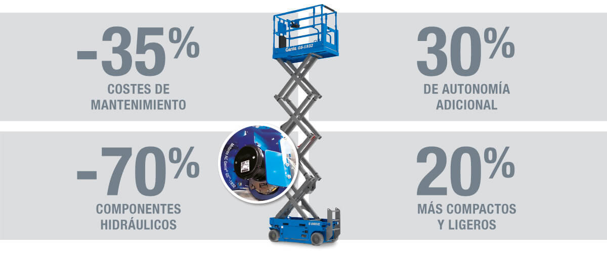 Las nuevas plataformas de tijera Genie® GS™ E-Drive están diseñadas con el sistema de accionamiento AC de última generación que no solo garantiza un valor de reventa optimizado a largo plazo, sino que también es una tecnología más fiable que la de de accionamiento hidráulico.