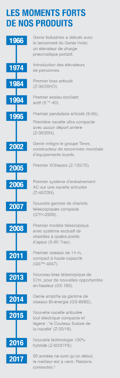 Au fil des ans, de nombreuses innovations Genie ont permis aux utilisateurs de travailler en hauteur et en sécurité tout en développant leur productivité : le pendulaire (Rotatif et plus tard le Jib-Extend™), le Xchâssis™, l’essieu oscillant actif, le Fast-Mast™, l’autodiagnostic embarqué Smartlink™ avec écran de navigation et codes erreurs pour rapidement reconnaitre pannes et mauvaises manipulations ou encore le système de roues sur chenilles TraX en quatre points indépendants, en sont quelques exemples.