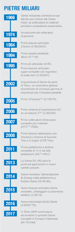 Con il passare degli anni, grazie alle molte innovazioni tecnologiche, Genie ha offerto la possibilità di lavorare in quota in modo sicuro, aumentando al contempo l’efficienza del lavoro. Alcuni tra questi importanti progressi tecnologici comprendono l’introduzione del jib (girevole o Jib-Extend™), del sistema XChassis™, del sistema di assali oscillanti attivi, della funzione Fast-Mast™, del sistema di comando SmartLink™ con autodiagnosi e risoluzione dei guasti integrate e del sistema di trazione TraX a 4 cingoli.