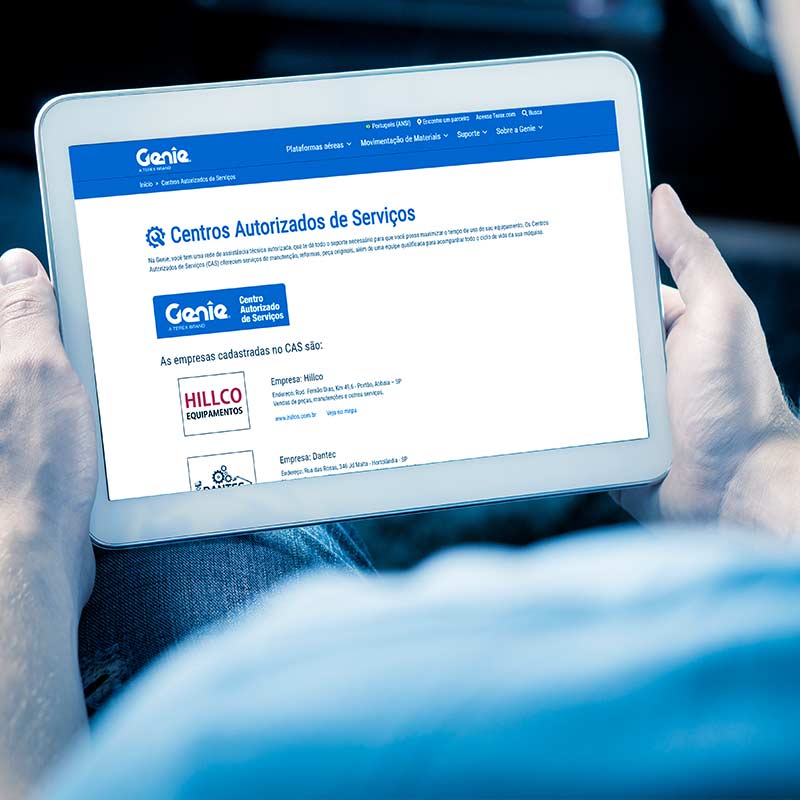 SA marca, que já se posiciona no mercado pela excelência no atendimento de pós-vendas, fortalece seus Centros Autorizados de Serviços (CAS) com a oferta de serviços de manutenção, reformas, peça originais, além de uma equipe qualificada para acompanhar todo o ciclo de vida da sua máquina. “Os CAS são homologados, treinados e acompanhados diretamente pelo nosso departamento técnico. O objetivo é manter nesses serviços prestados a qualidade e a garantia esperadas pela fábrica”, explica Elon Ferreira, especialista de serviços da Genie para a América do Sul.